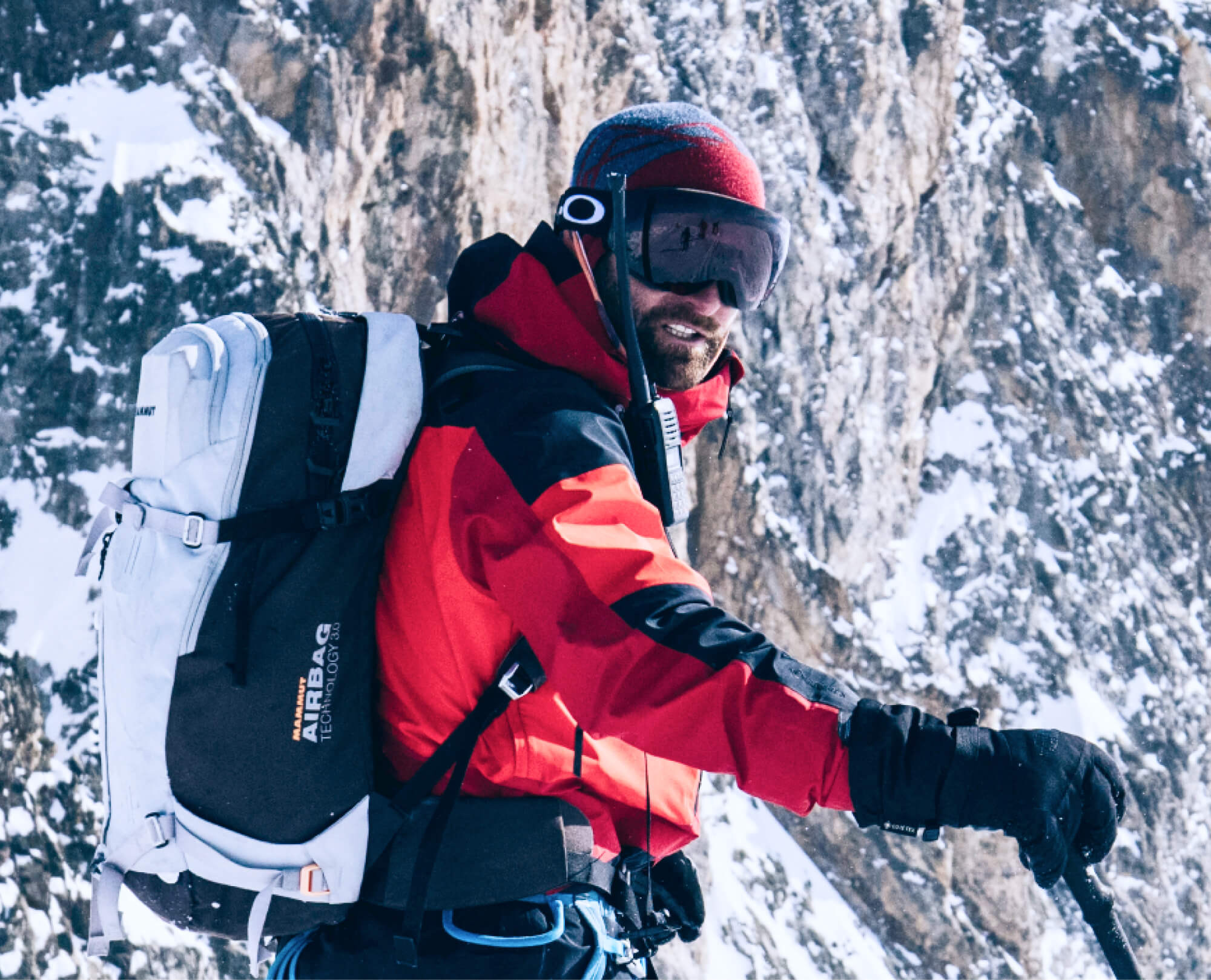 - Modern avalanche equipment by Mammut: airbags’ system and Barryvox transceivers.